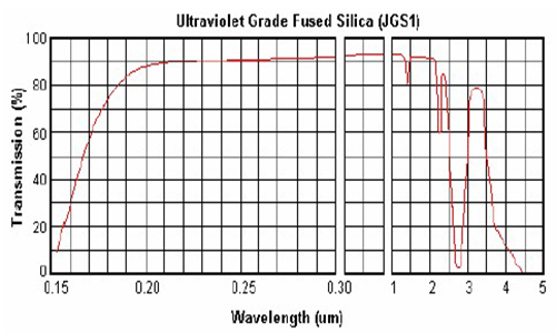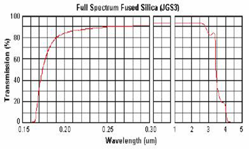 JGS3 is transparent in the ultraviolet, visible and infrared spectral regions, without considerable absorption bands in the 185-250 nm spectral region. It has no absorption bands in the visible physical properies with outstanding optical characteristics in the deep UV and the IR wavelength range. It is those requiring very wide wavelength range from DUV to MIR. It is quite a bit more expensive than Silicon and slightly less expensive than Calcium Fluoride or ZnS Multi-spectral grade.
