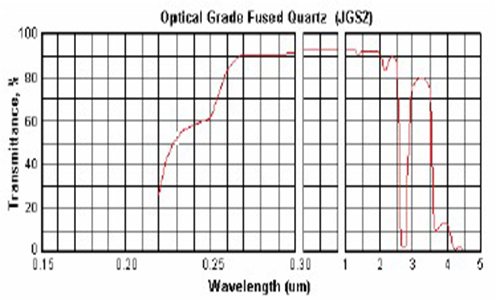 JGS1 is transparent in the ultraviolet and visible regions, and has no absorption hands in 170-250 nm wavelength intervals. It has intensive OH absorption band in the interval of wavelength 2600-2800 nm. JGS1 is used for optics operating in the deep UV and the visible wavelength range (Laser Lenses, Windows, Prisms, Mirrors, etc.). It is practically free of bubbles and inclusions.